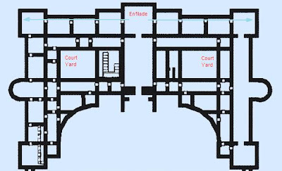 The Enfilade arrangement of principal state rooms (also can be called public rooms) was most common in grand European country houses during the Baroque era. Mainly during the 17th and 18th centuries.